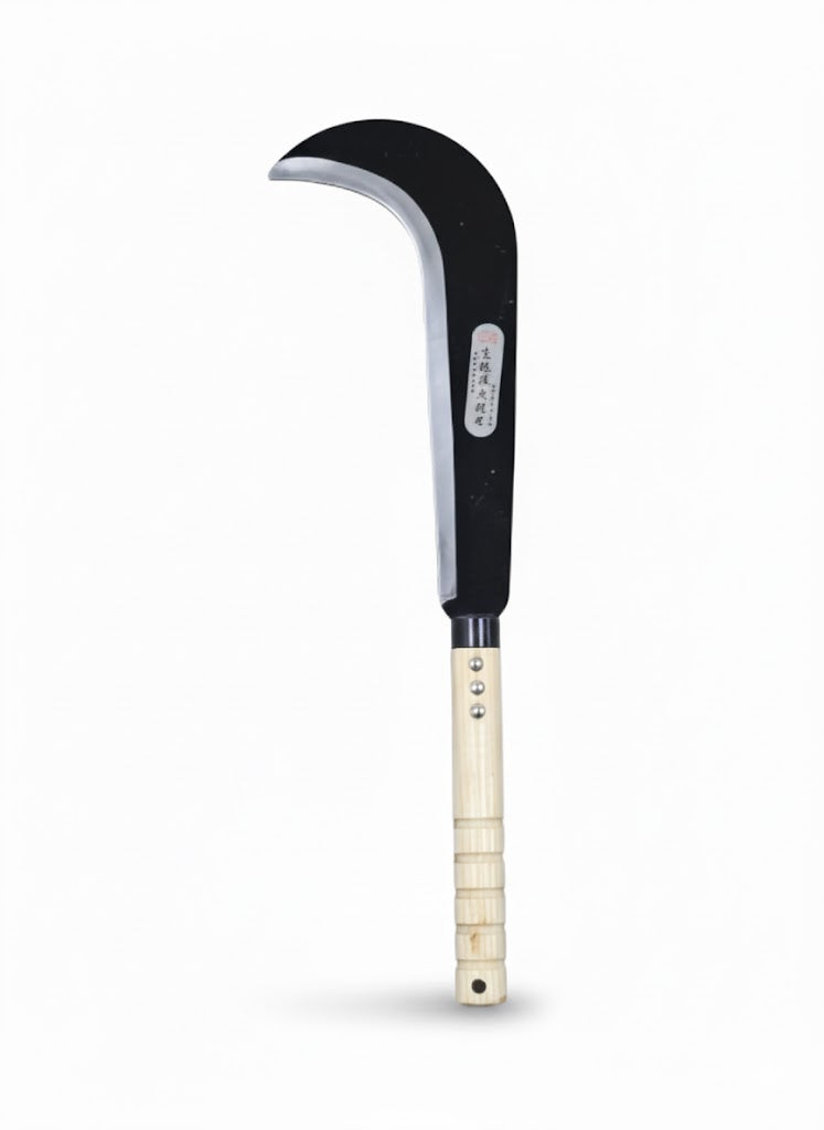 السكين مزودة بمقبض خشبي متين ومريح يمنح المستخدم قبضة ثابتة وآمنة أثناء العمل، مع تصميم موازن يقلل من الاهتزاز ويساعد في التحكم الدقيق أثناء القطع. شكل النصل المنحني يسمح بالوصول إلى المناطق الضيقة في قمة النخيل وتنفيذ عمليات التقليم بسرعة ودقة.