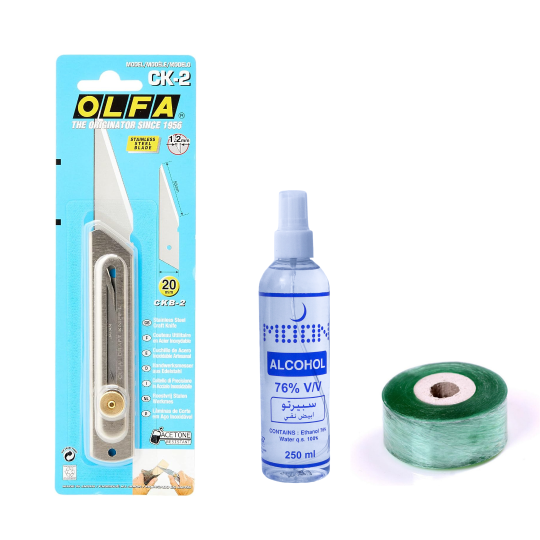 مجموعة أدوات التطعيم الاحترافية  المكونة من سكين أولفا الياباني المميز بأنه حاد جدا وغير قابل للصدأ ، المعقم الكحولي الايثانولي لمنع انتقال الآفات بين النباتات، لاصق التطعيم والتركيب لحجب الهواء عن نقطة التركيب ومنع جفافها.